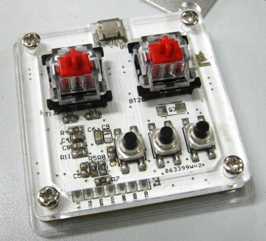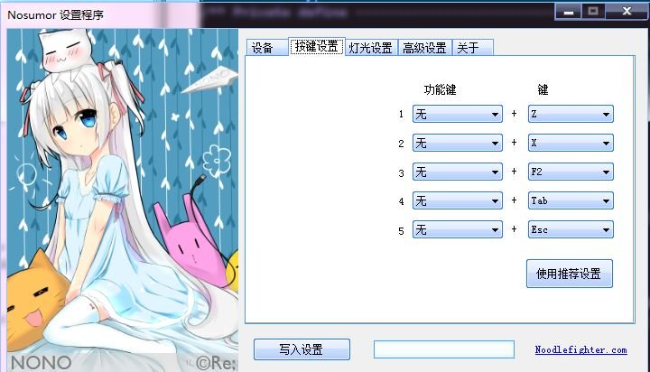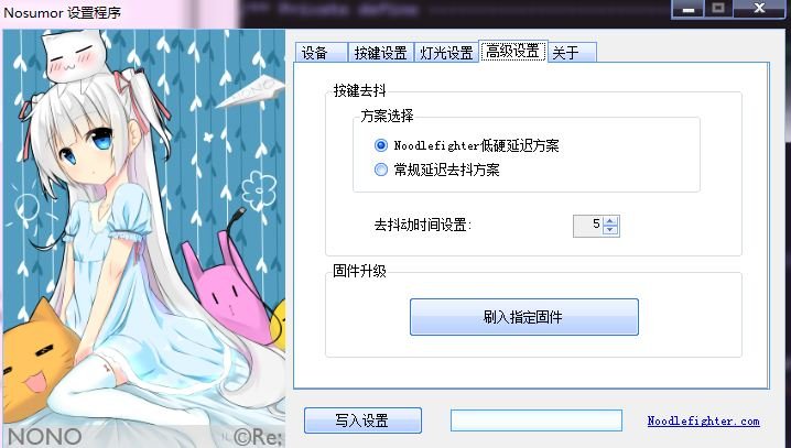 Nosumor 展示页 2024-05-19 主要特性 免驱动USB-HID设备——PC,安卓均可用 扫描频率1000Hz 最低传输延迟1ms 5个按键均可自定义键值,可定义成组合键(如Ctrl+R) 带钢板设计,更长键盘使用寿命 多彩LED灯,可以设置多种灯光模式(可设置可变色LED作为手速指示器以及其他特殊效果) 可选择去抖模式,以及设置除抖时间(随着按键老化可能双击现象,此时可以改变去抖时间以延长轴体寿命) 相关设置程序 可改变按键定义,配置灯光效果,更新固件。 视频展示默认灯光效果演示 玩家演示视频 图片展示 全亚克力外壳版本 铝制外壳版本