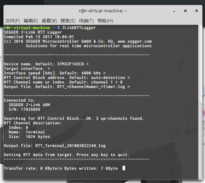 RTTClient最常用也很方便用, 它会不断地尝试连接到Debugger开放的19021端口, 比如开启JLinkGDBServer或者Keil的Debugger之后它就会自动连上去, 显示channel0的数据: