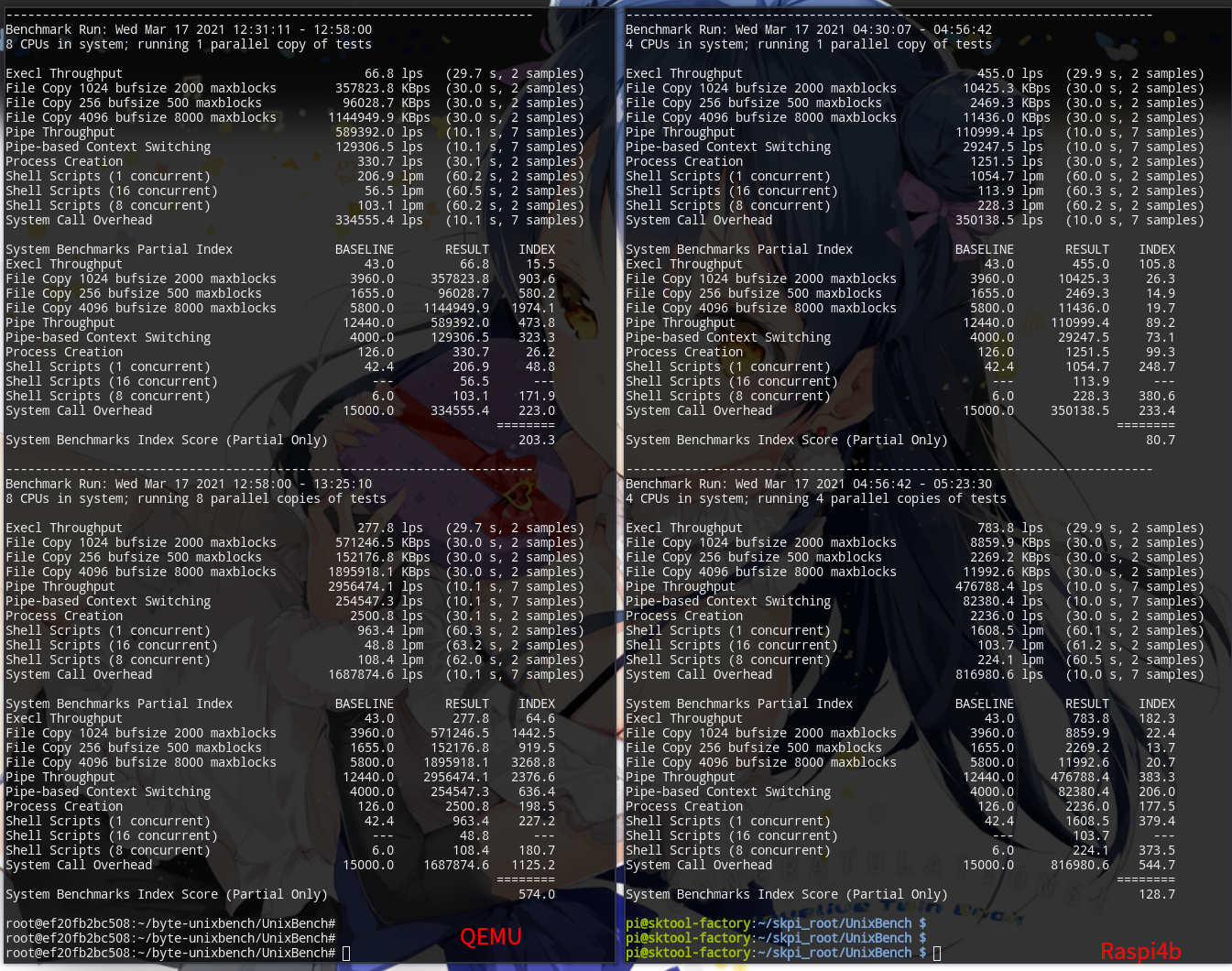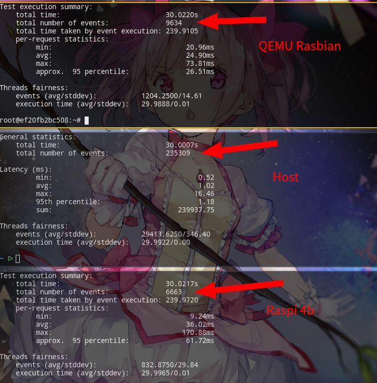 | Host: AMD 3400G, Manjaro, sysbench 1.0.20 QEMU Rasbian: */Rasbian skretch/sysbench 0.4.12 Raspi 4b : Broadcom BCM2711, Quad core Cortex-A72/Rasbian buster/sysbench 0.4.12 --- 测试项cpu(单线程) sysbench --test=cpu --max-time=30 --num-threads=1 run 测试项cpu(4线程) sysbench --test=cpu --max-time=30 --num-threads=4 run 测试项cpu(8线程) sysbench --test=cpu --max-time=30 --num-threads=8 run