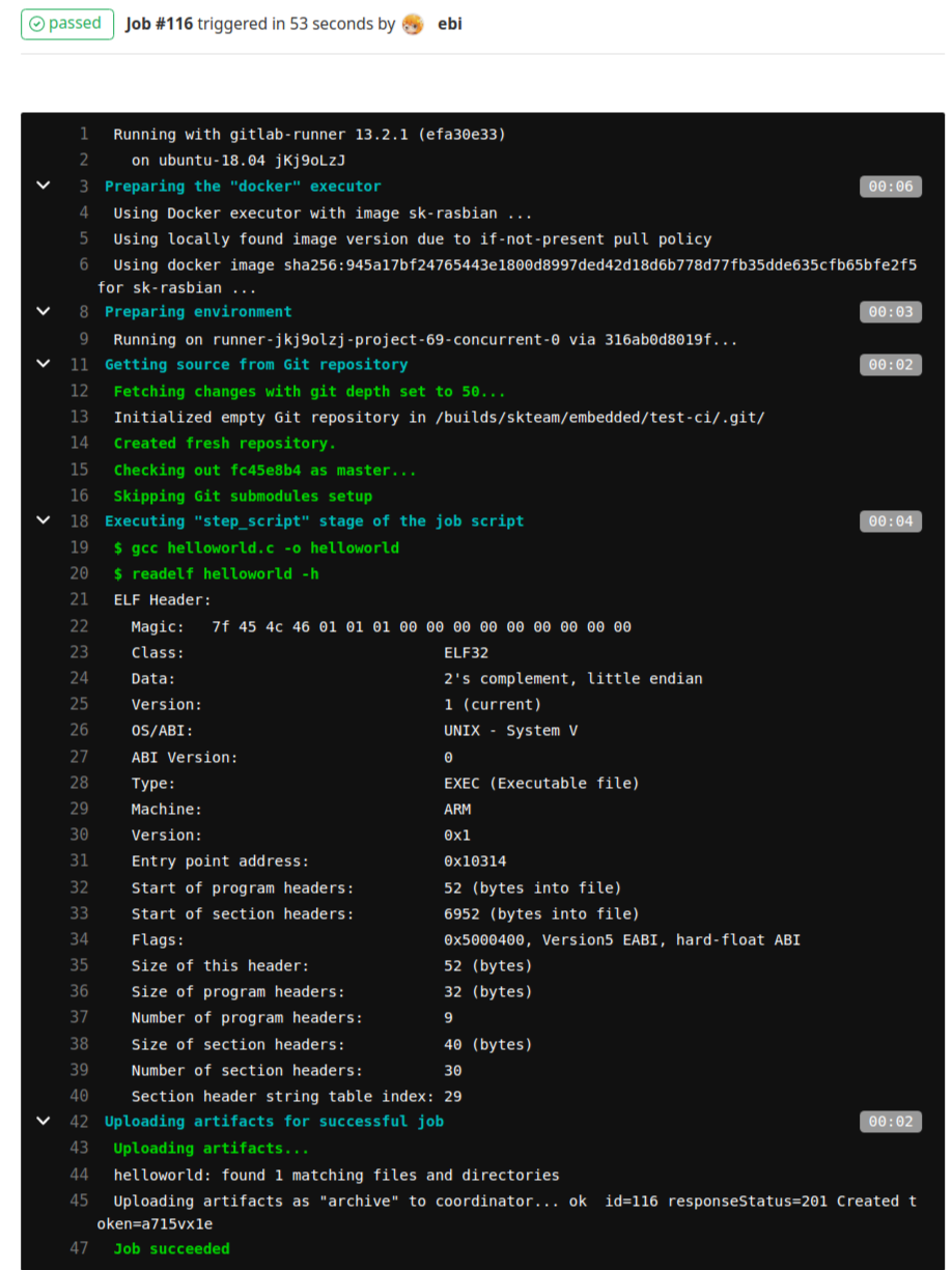 | build: stage: build tags: - rasbian script: - gcc helloworld.c -o helloworld - readelf helloworld -h artifacts: paths: - helloworld