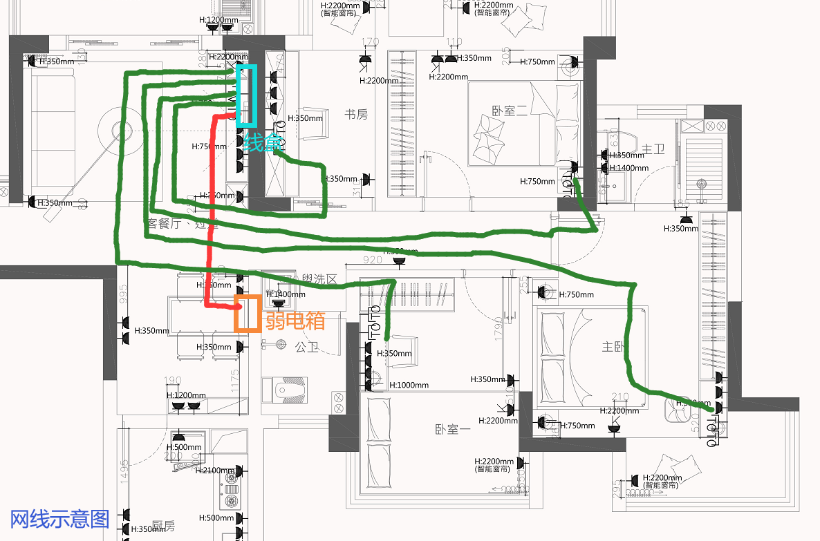 - 到每个房间、客厅电视柜的线,各走2根管,一根管走网线(纯铜超五类线)、一根预留空管,放一根占位用铁丝(日后用于光纤音视频等用途预留)