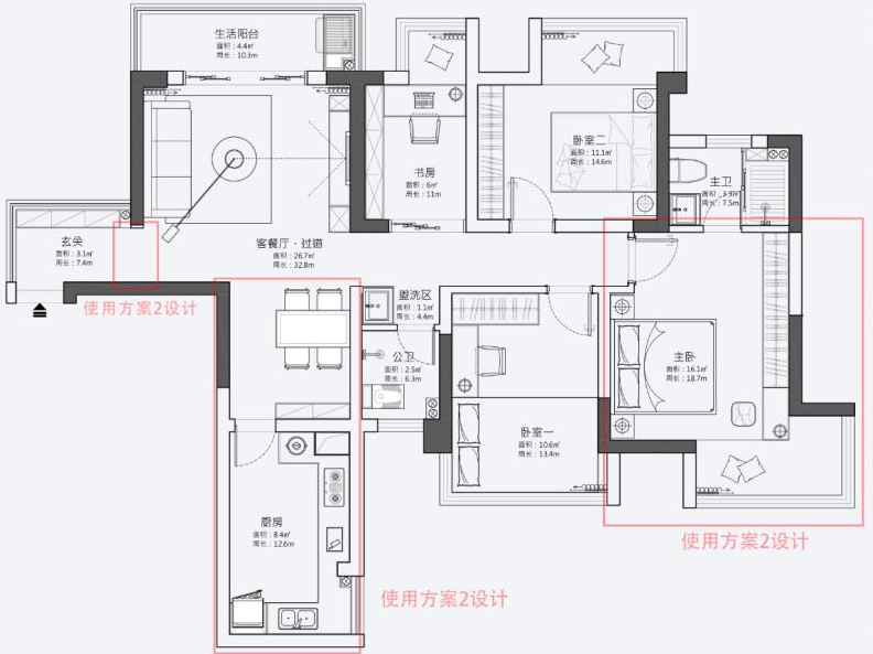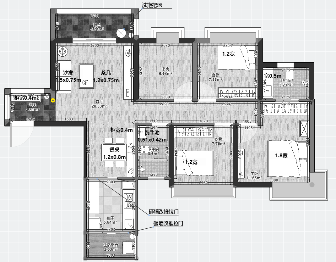 方案B:只打掉生活阳台的墙;优点是厨房从5平变到8平,宽敞了不少,而且餐厅的角落能做柜子;缺点是没专门晾衣服的地方了,得把景观阳台变为生活阳台
