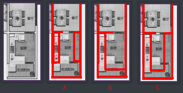 方案C:打掉生活阳台,厨房也改双排,得到一个最大的厨房;方案AB的缺点同时存在