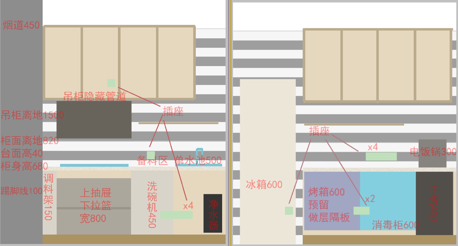 - 考虑厨下直饮水和垃圾处理器,留2个插座