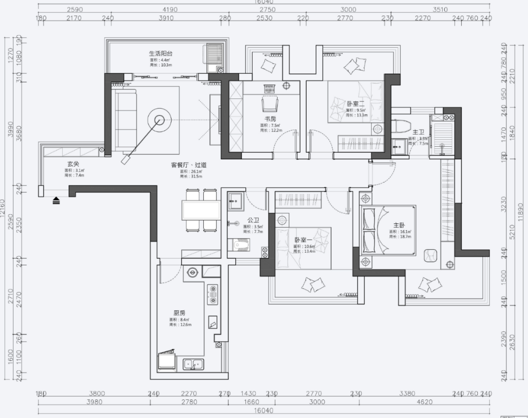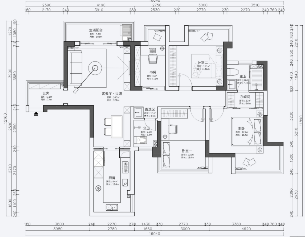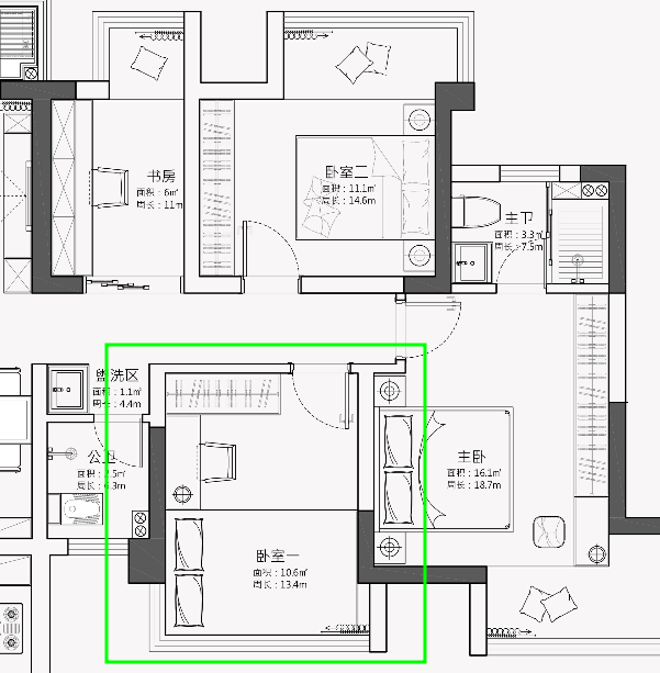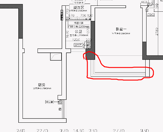- 主卧的形状别扭,过道长长