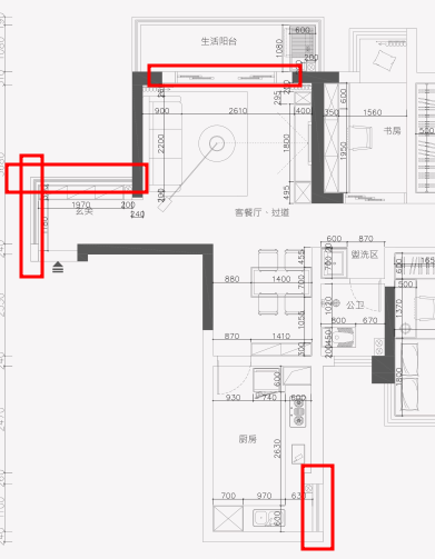 方案A:改餐厅到厨房的墙、拆生活阳台的墙,厨房改双排;优点,厨房可用台面变大,生活阳台也保留;缺点;餐厅动线严重受影响,需要靠边摆放餐桌,不然平时得绕过餐桌才能到达厨房