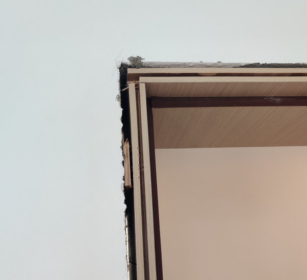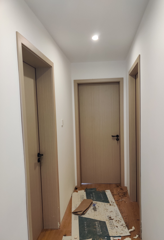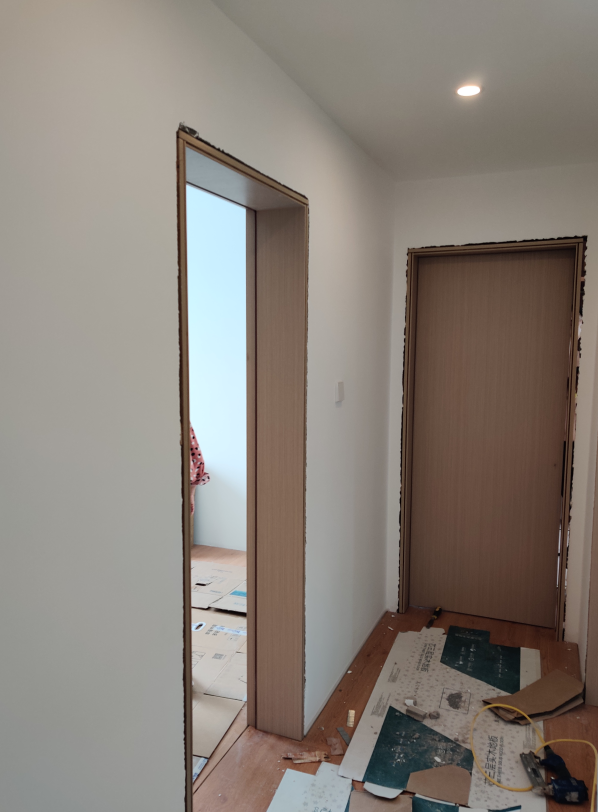 木门的木制双边门套就简单了,直接在裸的毛坯墙面上装了就是: