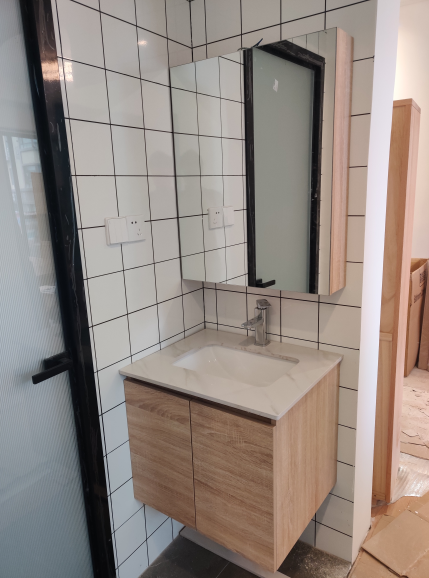 差点打算不装屏风了,然而一日在某宝瞎逛,让我找到了岩板+台下盆的组合,可以做到精确60cm宽,加上宽3cm的铝合金屏风,正好塞下63cm的宽度。安装上洗手池,准备等做了木地板压边条再定屏风: