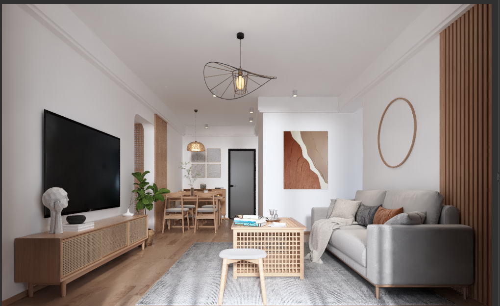 - 然后到客厅,宽度够放个三座的沙发,距离电视4米也可以有不错的观感,尺寸虽小但不影响功能;