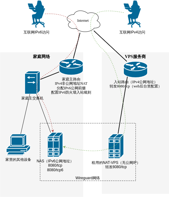 宽带入户,主路由器通过IPv4访问互联网,但没有公网地址,所以租用VPS做端口转发,作为IPv4网络入口