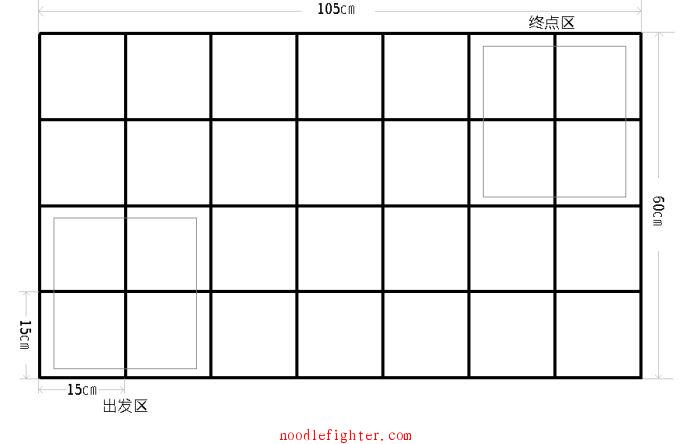 - 场地的引导线宽度2cm,可以涂墨或粘黑色胶带。示意图中的和尺寸标注线不要绘制在白纸上,出发区和终点区的边框为 25cm*25cm 用签字笔细线标注。