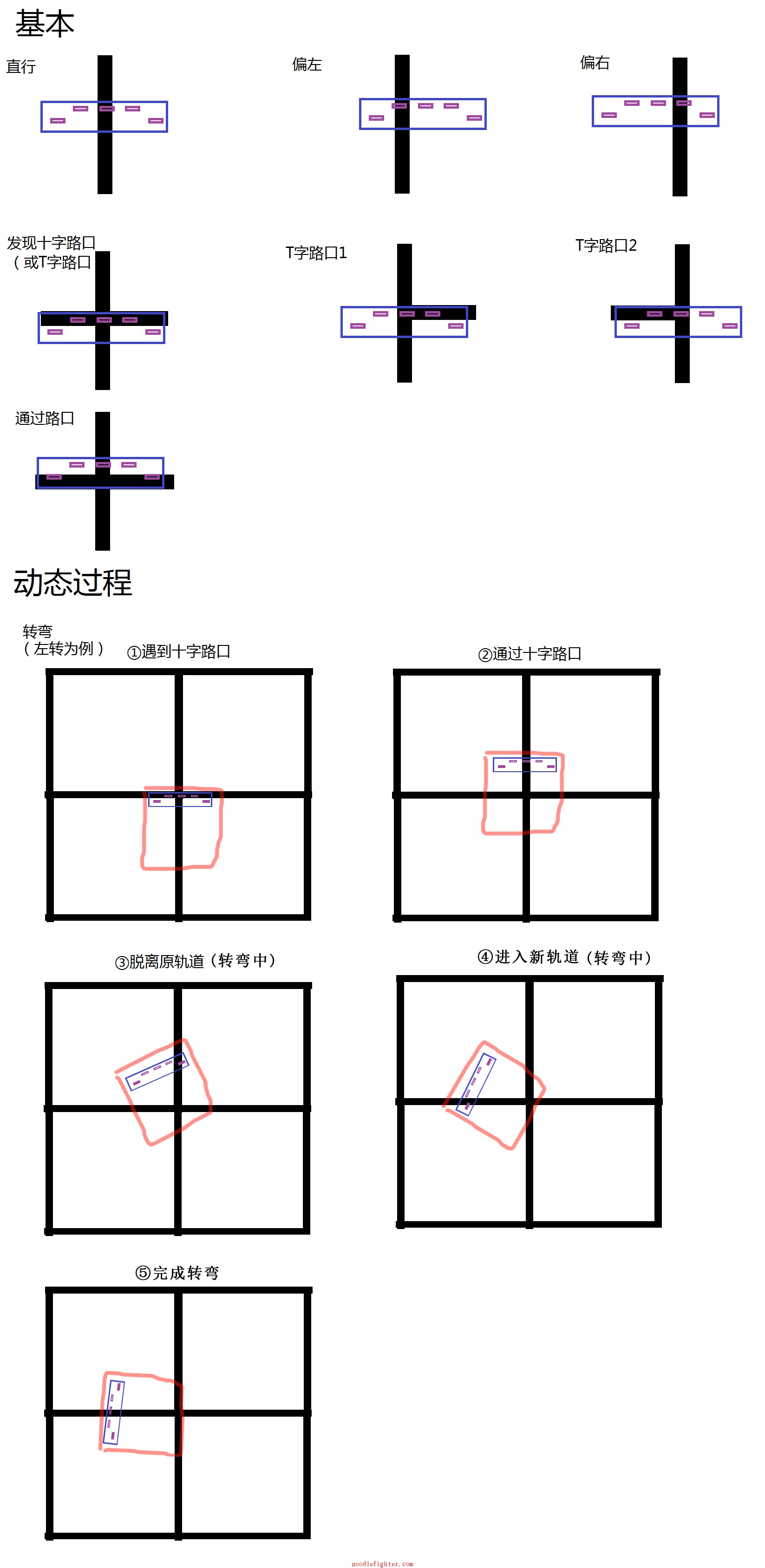 (可以看出“普通转弯”和“紧急转弯”的应用时机不同,因为车的体态不一样,这里的普通转弯有一个轮子前进半圈的过程(为了转弯后,车身能与轨迹平行),而紧急转弯是直接转动车身。)