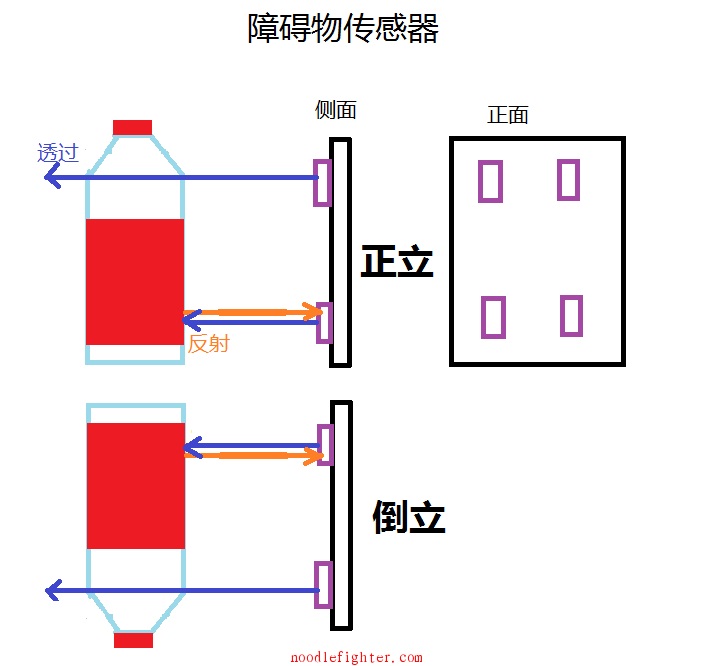 同样使用红外一体管,通过区分当前高度能否接收到一定量的反射光来判断正瓶子的正倒立。